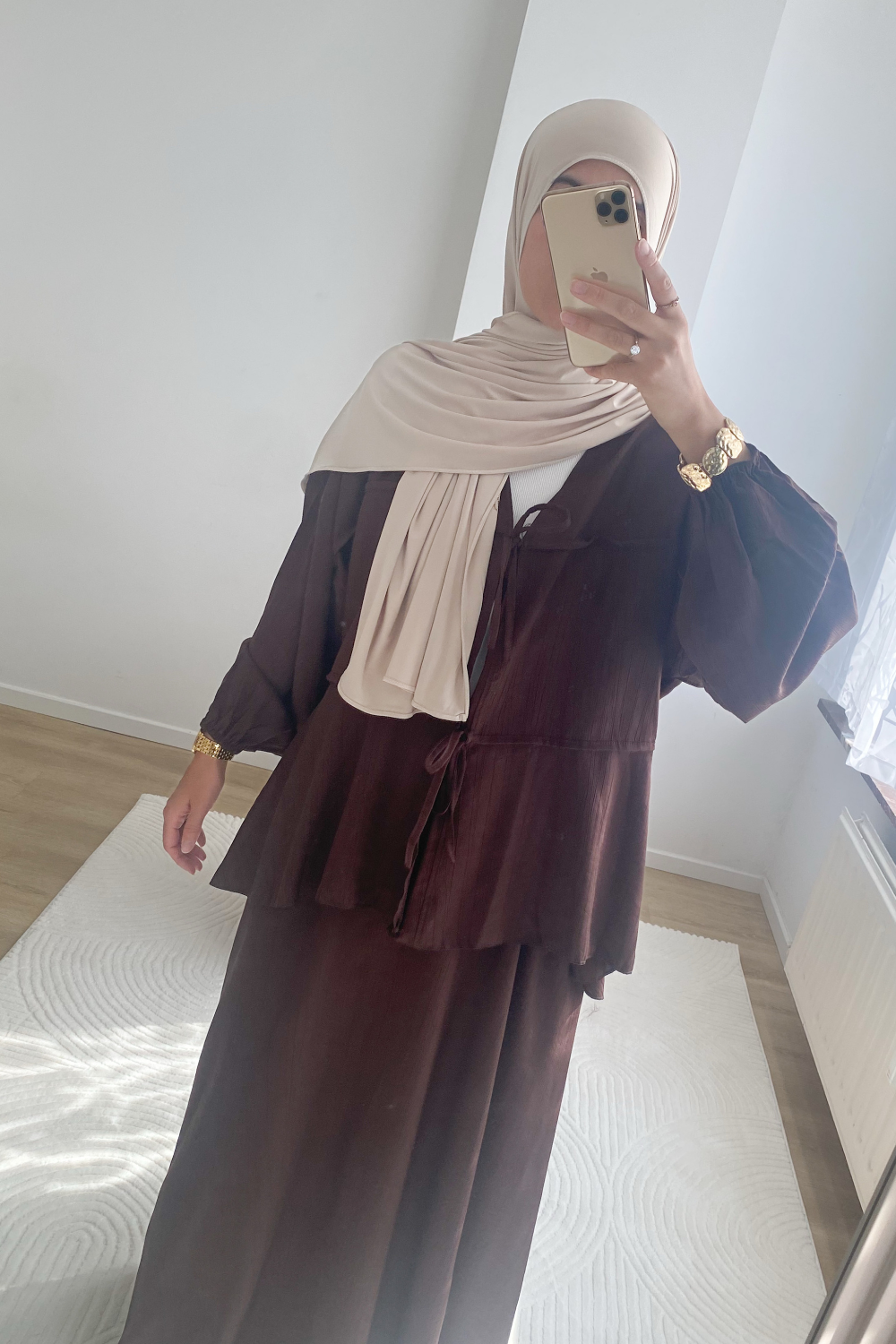 De Aasiyah Set is verkrijgbaar in drie verschillende kleuren: beige, donkerbruin en zwart. Ontworpen in één veelzijdige maat die geschikt is voor verschillende maten.