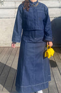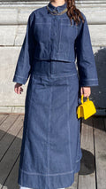 De Yara Denim Set bestaat uit een stijlvolle denim top met een elegante fit en een soepelvallende lange rok die zorgt voor een feminine, classy look.